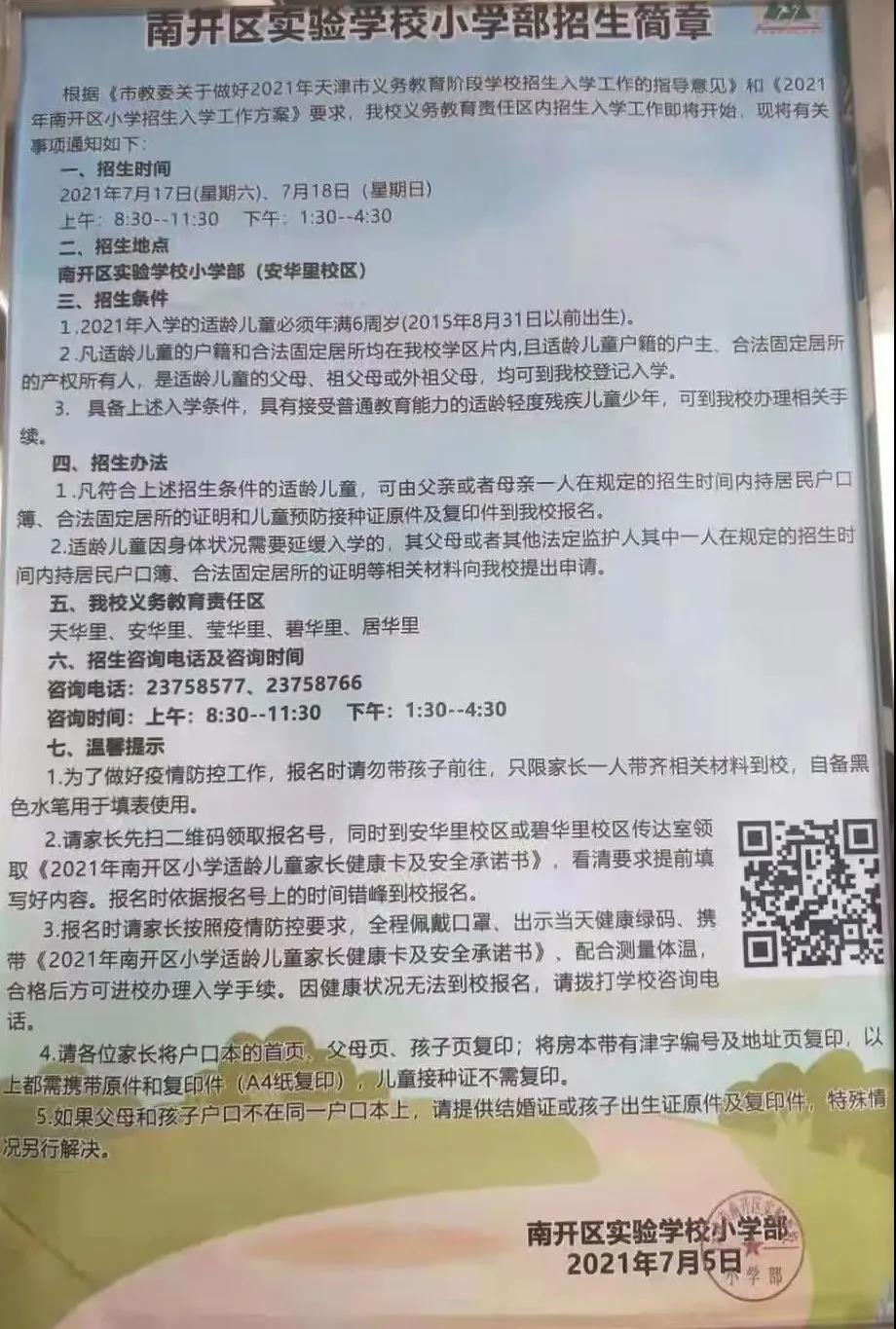2021年天津市南开区南开实验学校小学部招生简章,含招生咨询电话和学区范围划分