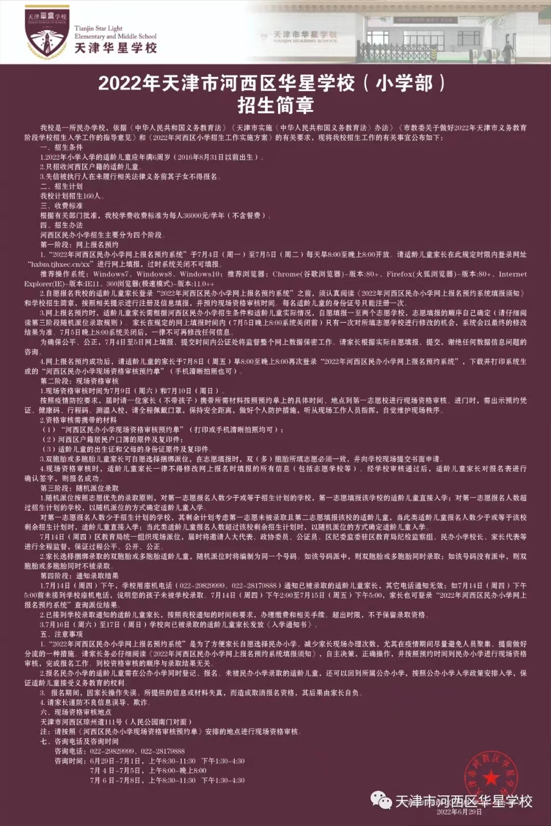 2022年天津市河西区华星学校小学部招生简章,含招生咨询电话和学区范围划分