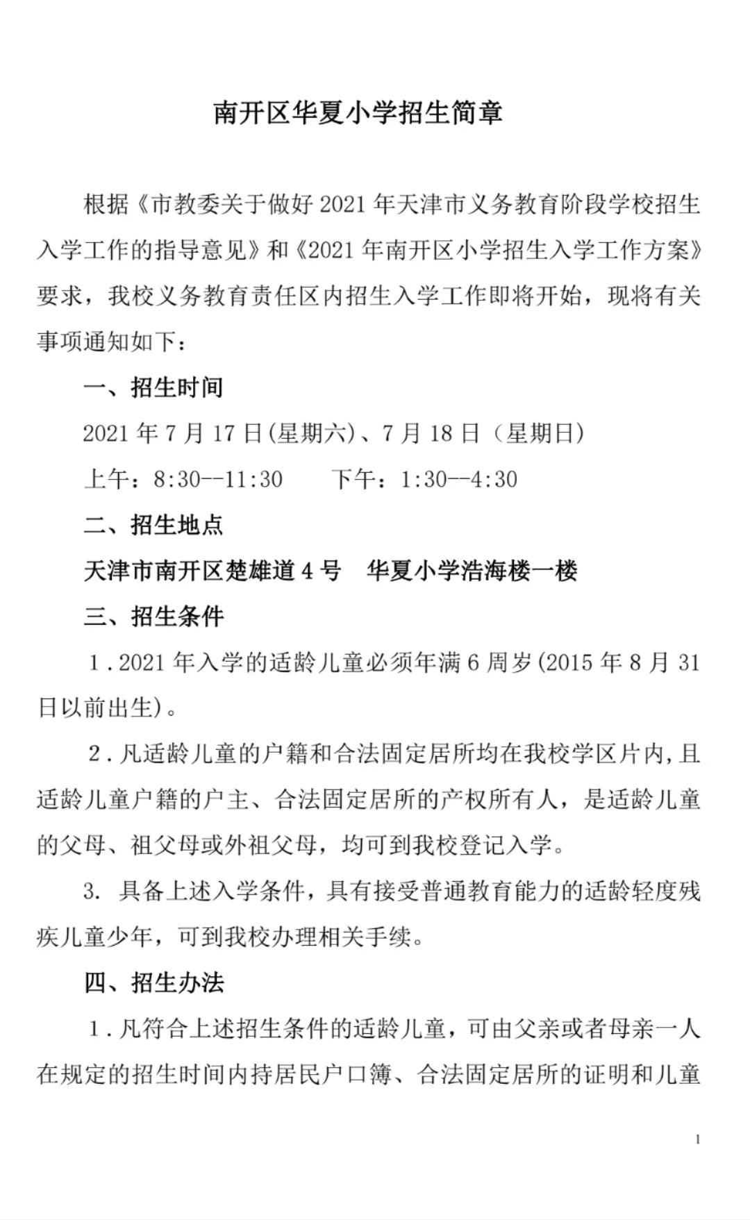 2021年天津市南开区华夏小学招生简章,含招生咨询电话和学区范围划分