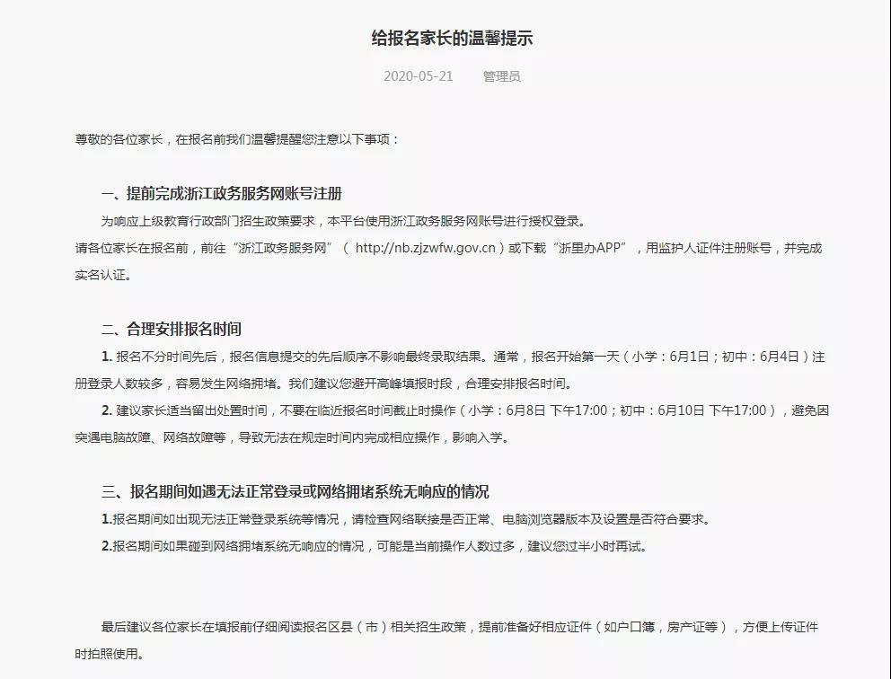 监护人提前在浙江政务服务网注册账号后,通过授权登录招生管理系统,完成学生基本信息填写,对照报名条件选择北仑区进入报名通道,并按照身份类别,登记信息,选报志愿。