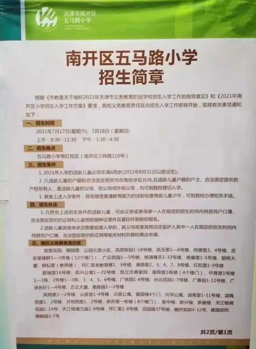 2021年天津市南开区五马路小学招生简章,含招生咨询电话和学区范围划分