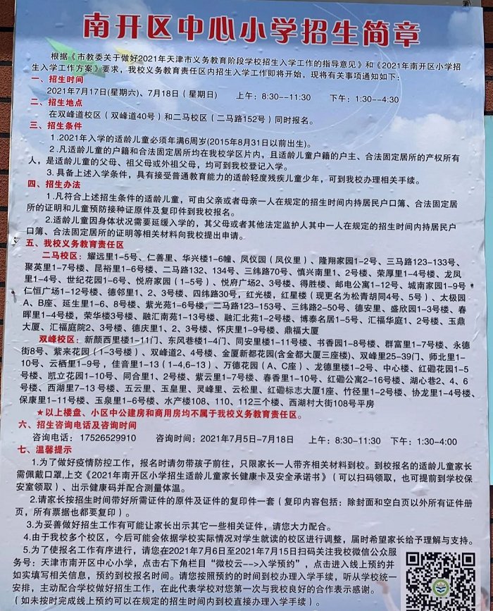 2021年天津市南开区南开中心小学招生简章,含招生咨询电话和学区范围划分