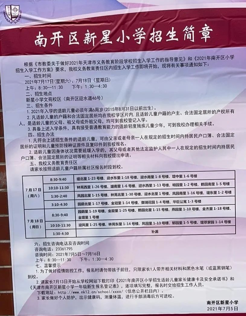 2021年天津市南开区新星小学招生简章,含招生咨询电话和学区范围划分