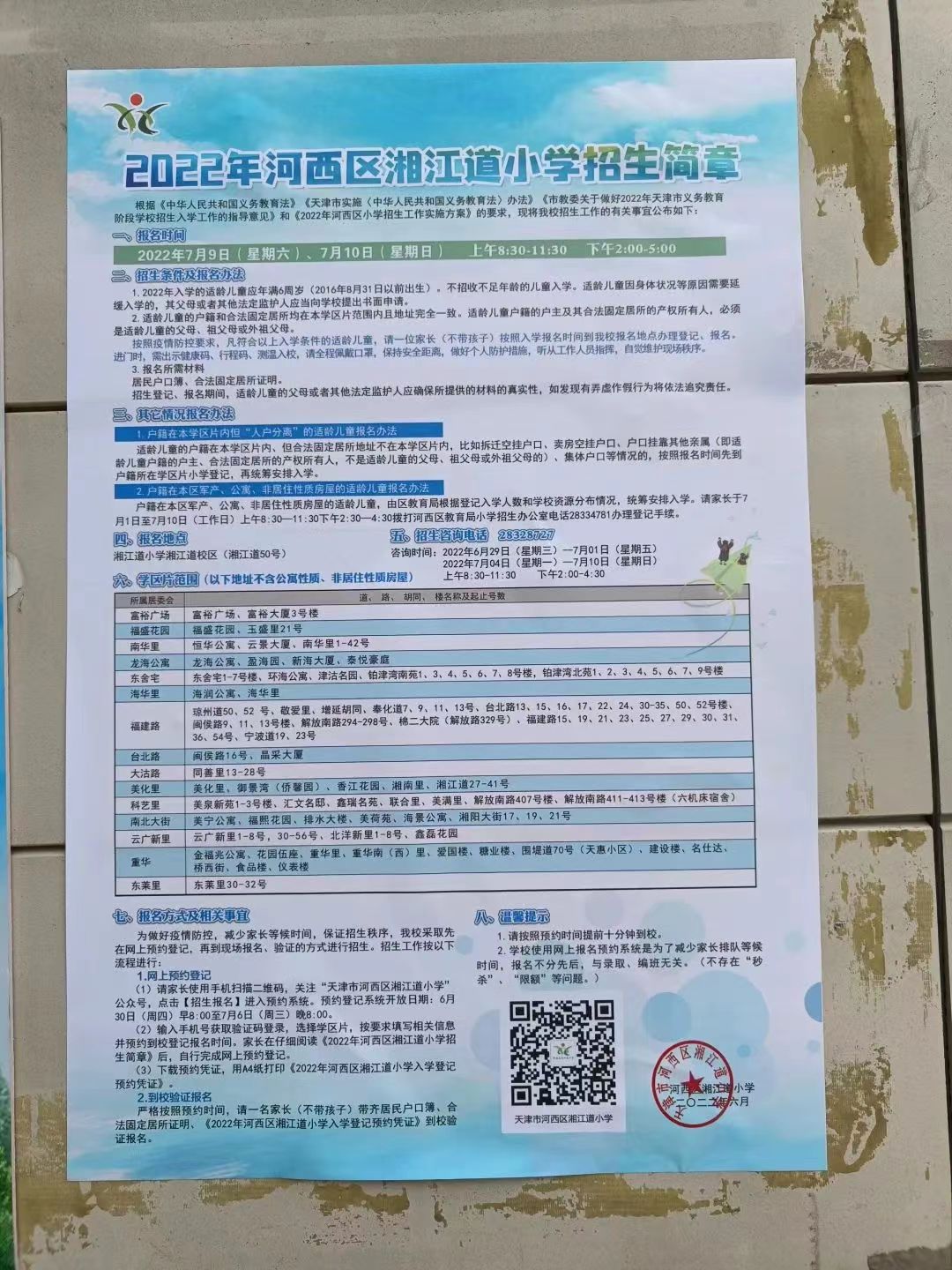 2022年天津市河西区湘江道小学招生简章,含招生咨询电话和学区范围划分
