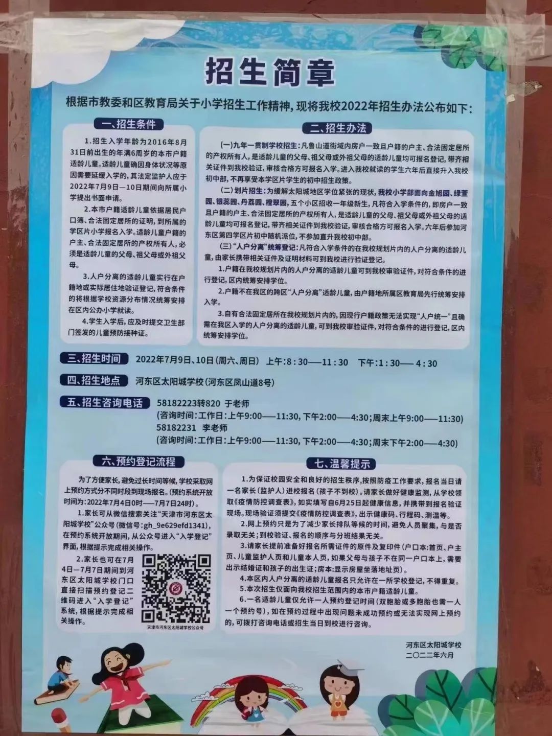 2022年天津市河东区太阳城学校招生简章,含小学学区招生范围划分以及招生咨询电话